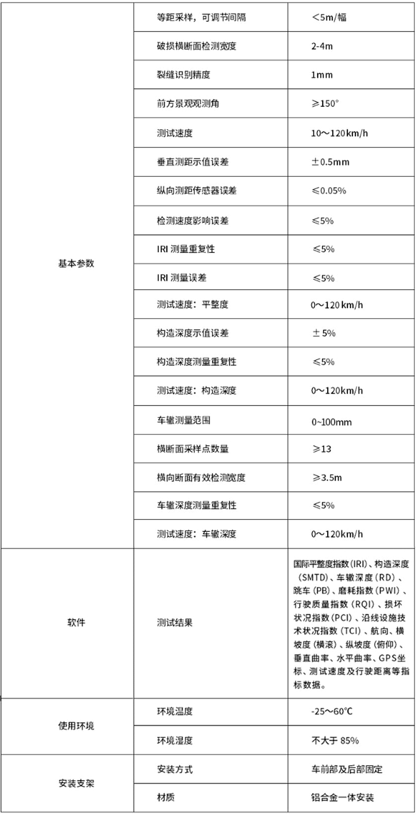 - 检测技术指标符合国家路面验收与养护标准规范:《公路工程质量检验评定标准》(JTG F80/1-2017)、《公路技术状况评定标准》(JTG 5210-2018)、《公路路基路面现场测试规程》(JTG 3450-2019);符合交通部《公路路面技术状况自动化检测规程》(JTG/T E61-2014)、《车载式路面激光平整度仪》(JT/T 676-2009)、《车载式路面激光构造深度仪》(JT/T 840-2012)、《车载式路面激光车辙仪》(JT/T 677-2009)和《多功能路况快速检测设备》(GB/T 26764-2011)等行业标准。